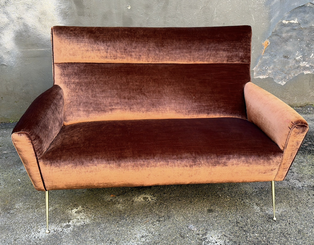 Divano vintage anni ’50 Anni’50 Materiale: legno e velluto marrone cangiante Dimensioni : Altezza 94 cm, altezza seduta 43 cm, lunghezza 140 cm, profondità 75cm Quantità: 1 Aggiungi Post